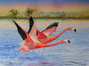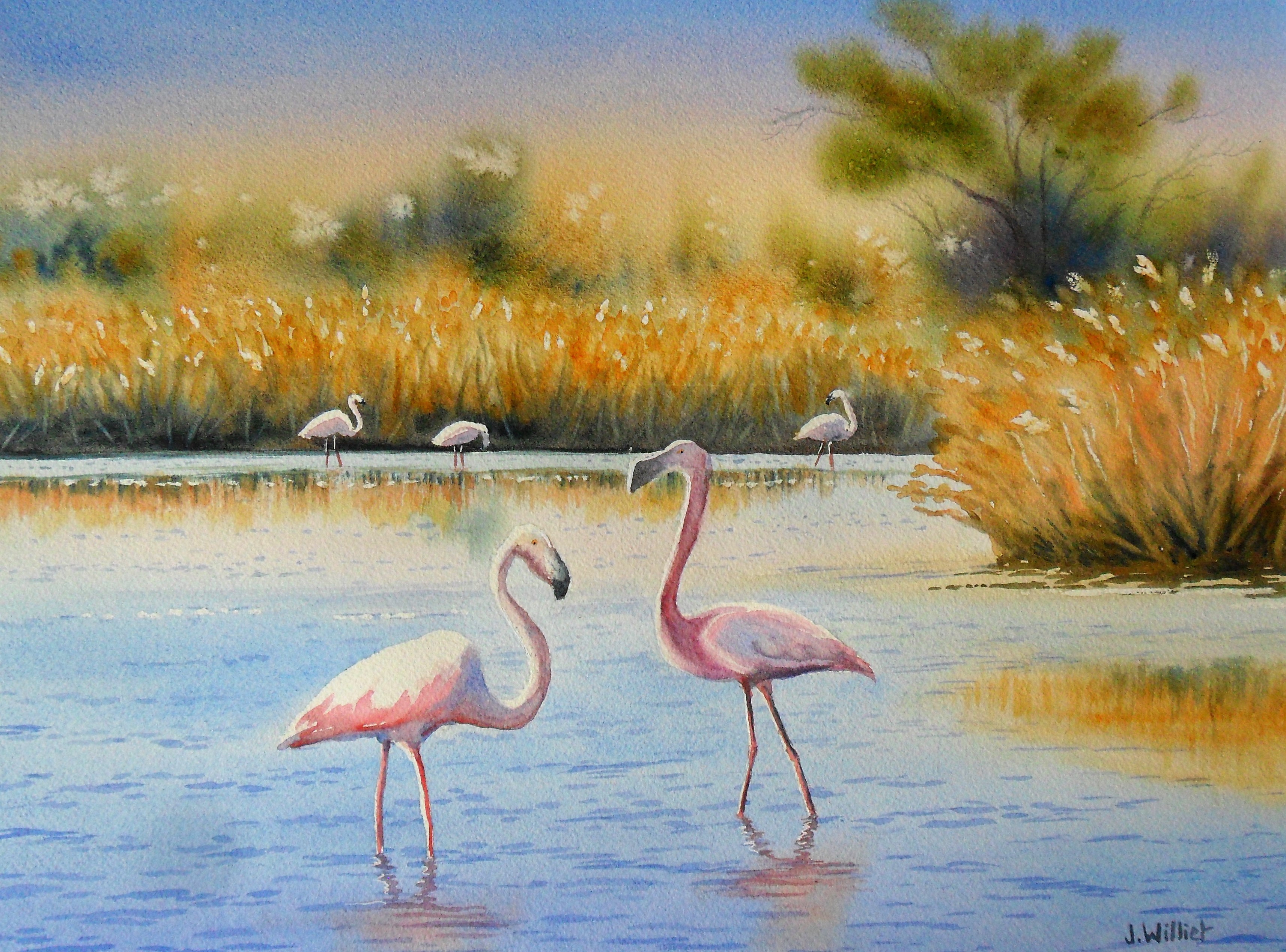Cette autre aquarelle est un hommage à l’heure exquise.. Celle de la fin du jour et des couleurs rosées qui embrassent l’eau, les roseaux, et la sérénité des flamants..