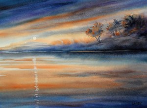 Il est un exercice qui permet de travailler cela : le ciel. Il y a mille et une façons de le traiter : dans le mouillé, dans le choix des couleurs, dans la présence ou non de nuages , de soleil, d’oiseaux, d’effets de contrastes, dans ses fondus avec la végétation.. Et c’est encore un autre défi d’y adjoindre l’eau et les reflets du ciel..