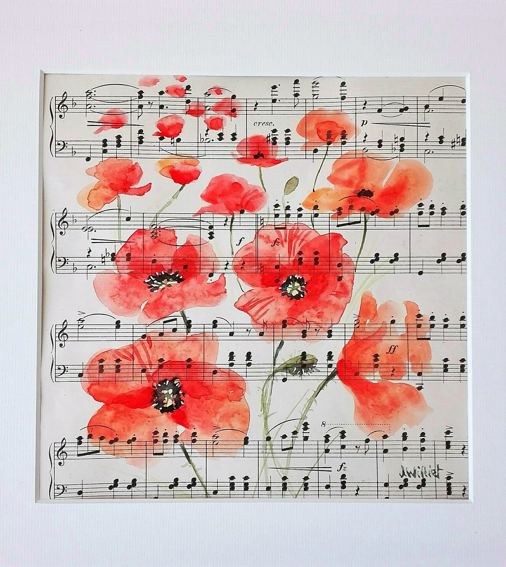Une très belle idée de peindre sur une partition! On a l’impression que vos coquelicots montent et s’envolent comme les notes de musique! Félicitations pour votre tableau!