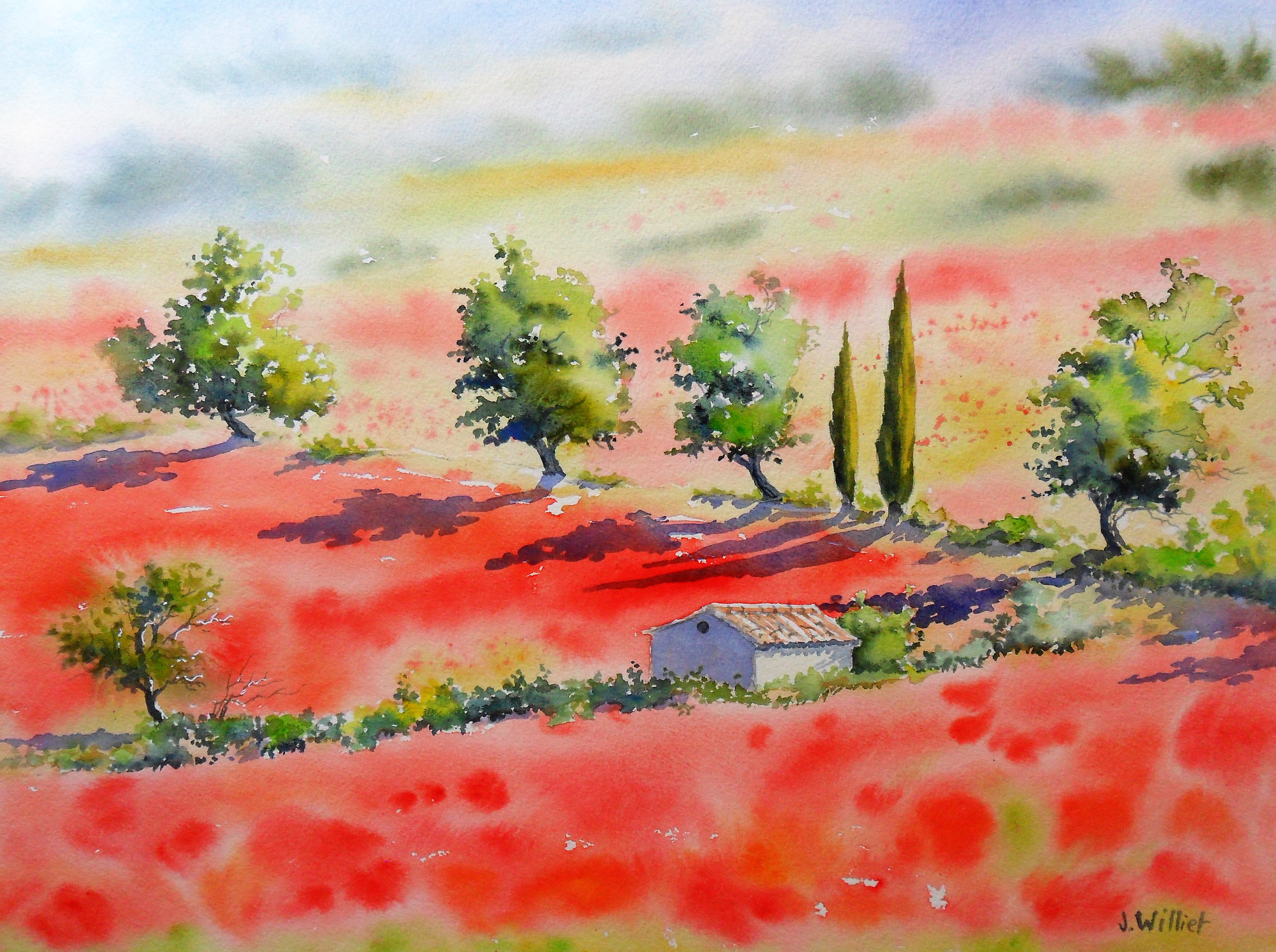 Il y a aussi cette dernière aquarelle sur un champ de coquelicots, caressé de l’ombre des arbres :