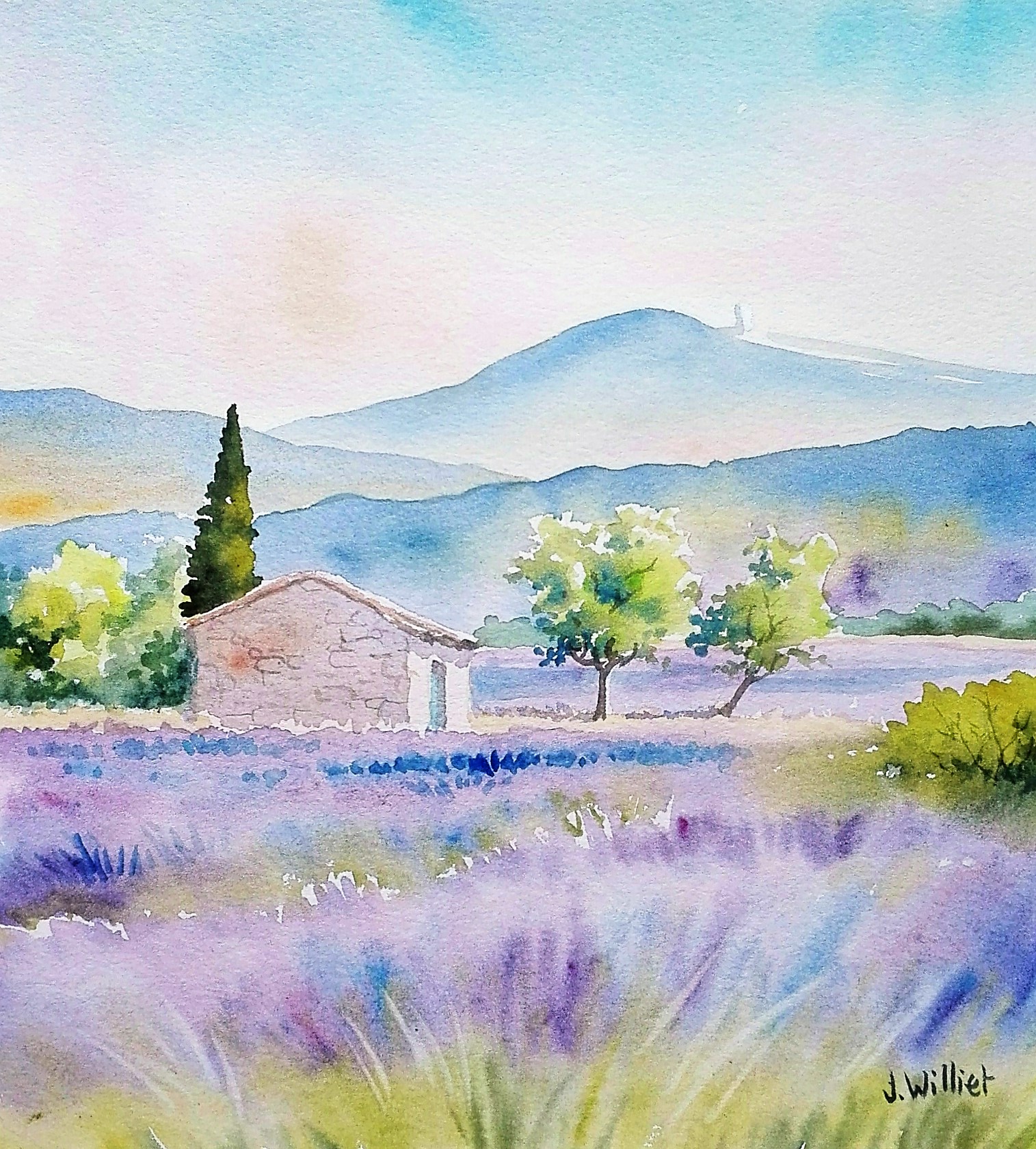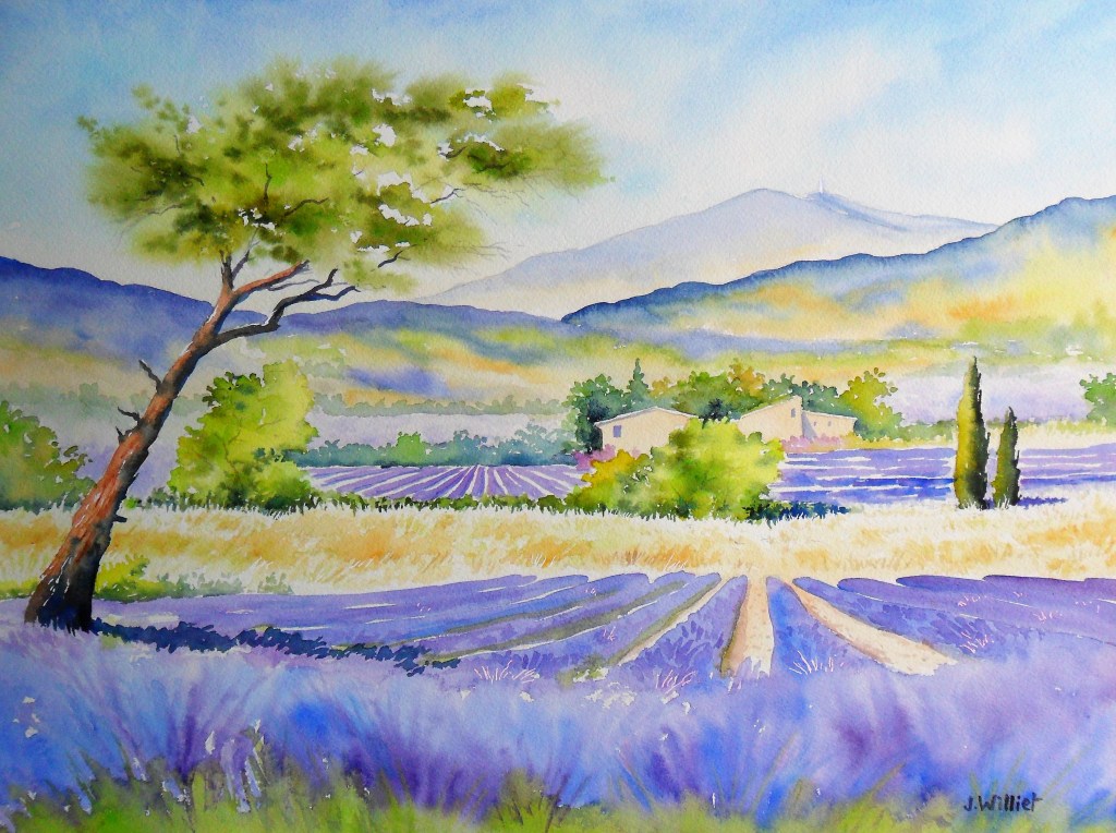 « en petit format » une aquarelle de champs de lavande avec en fond le Mont Ventoux ?