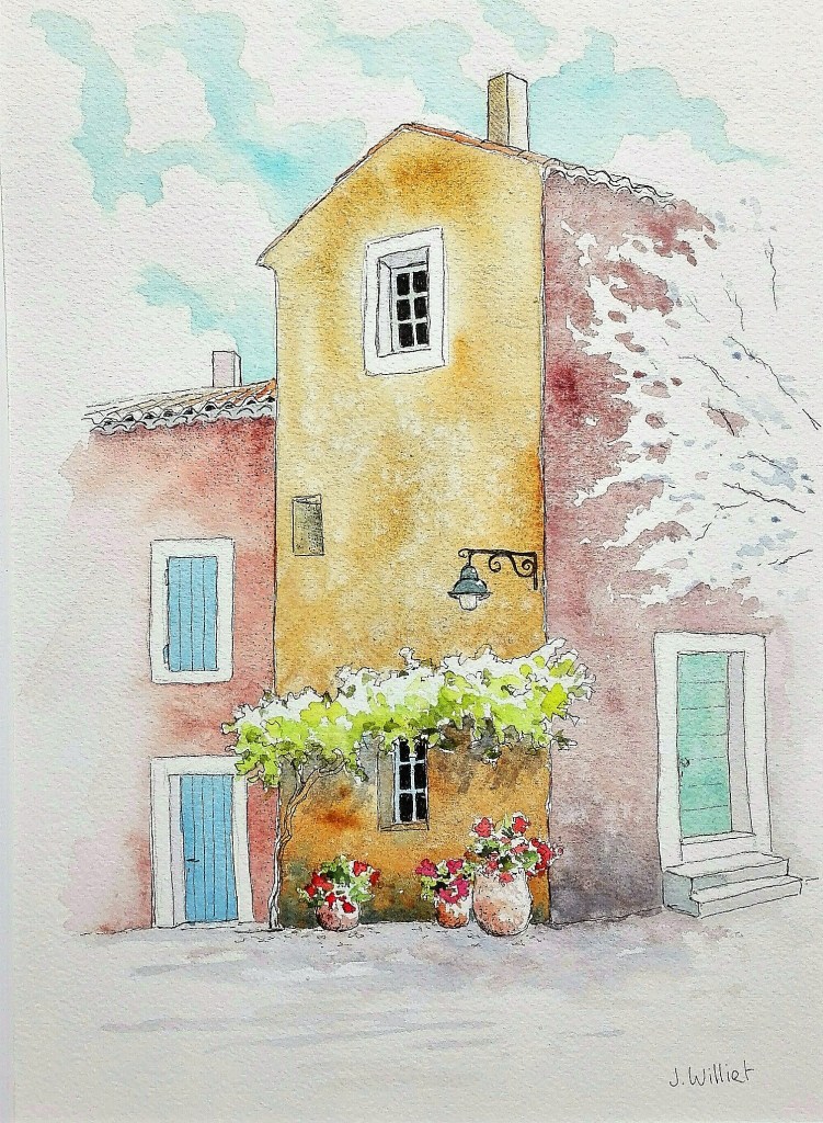 L’une avec un dessin préalable à la pointe fine (inspiré d’une façade à Roussillon), l’autre étant un brou de noix.. Les deux permettent de progresser dans les différentes approches techniques de l’eau et des couleurs..