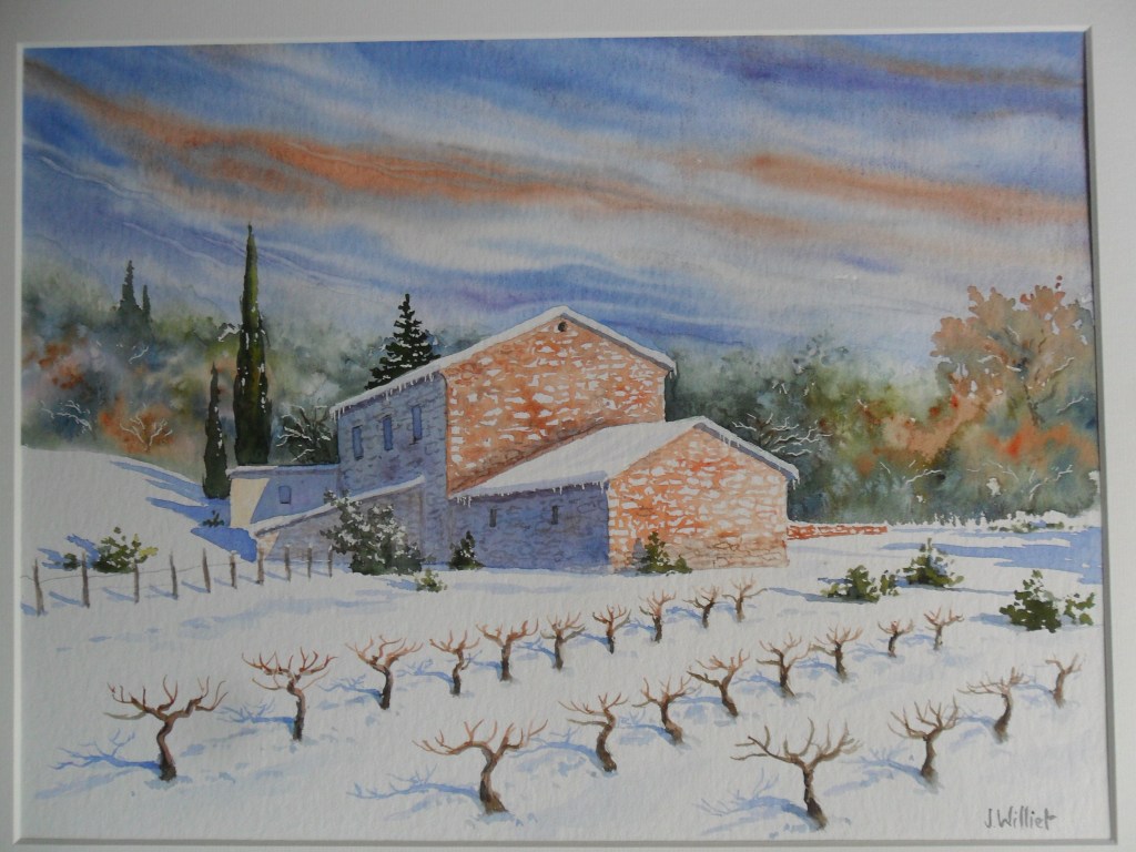 Hasard ou pas, à l’heure où l’on se demande si la neige deviendra aussi rare que les victoires des tennismen français en grand chelem, j’ai repris cette ancienne aquarelle de décembre 2019.. Vous vous en souvenez ? C’était un exercice proposé sur mon site. Je n’avais jamais été satisfait de mes vignes ; elles me narguaient de leur médiocrité.. Ni une ni deux, un coup d’éponge (comme un coup de karcher à la Sarkozy) et j’ai remplacé la neige par de la lavande…