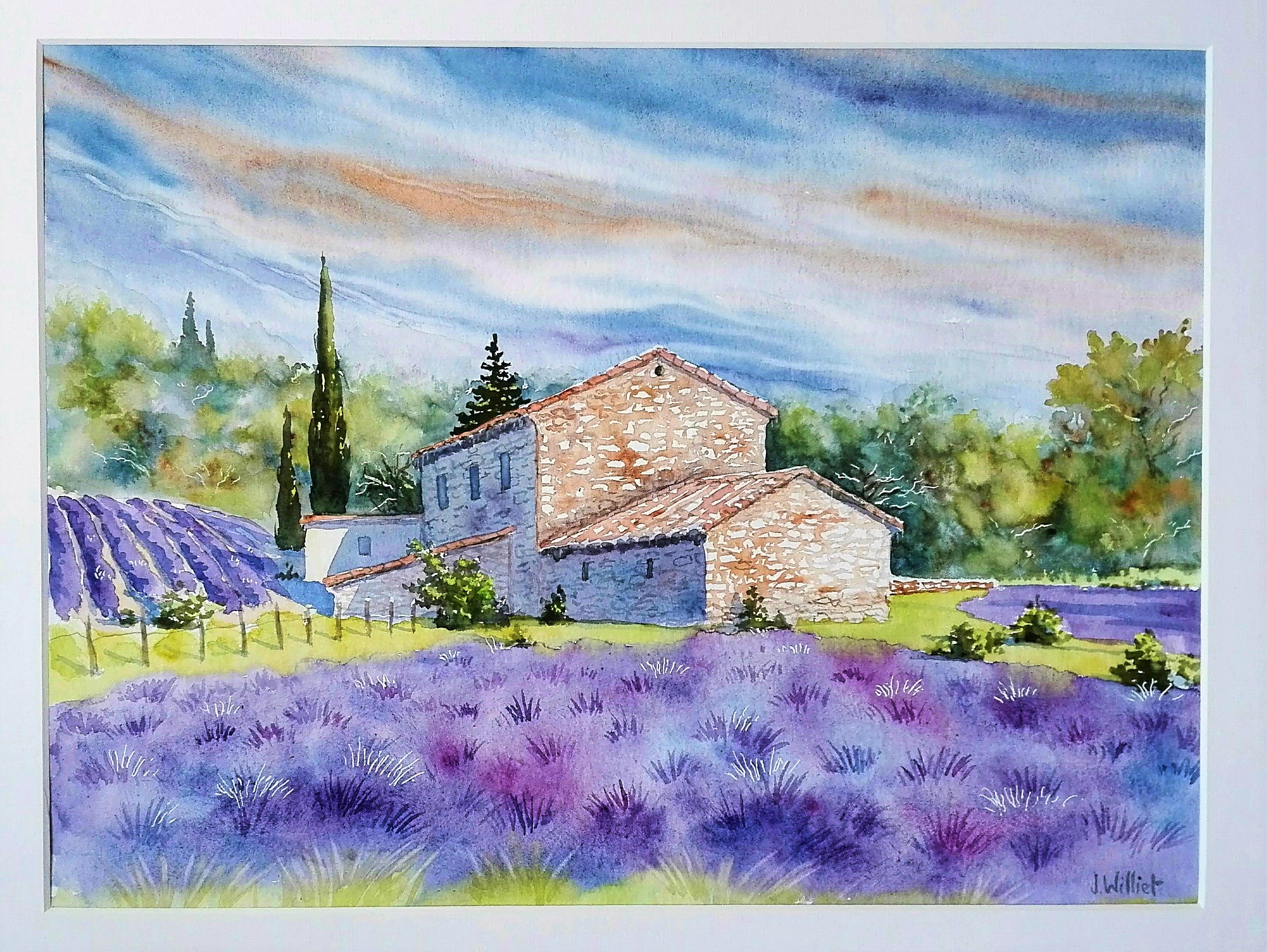 Il ne faut pas vous décourager pour vos oeuvres présentées au salon d’aquarelle. Pensez à toutes les personnes qui les apprécient. J’aime beaucoup l’idée des lavandes à la place des vignes. J’avais apprécié ce sujet d’exercice. Bon dimanche… pluvieux…A très bientôt.
