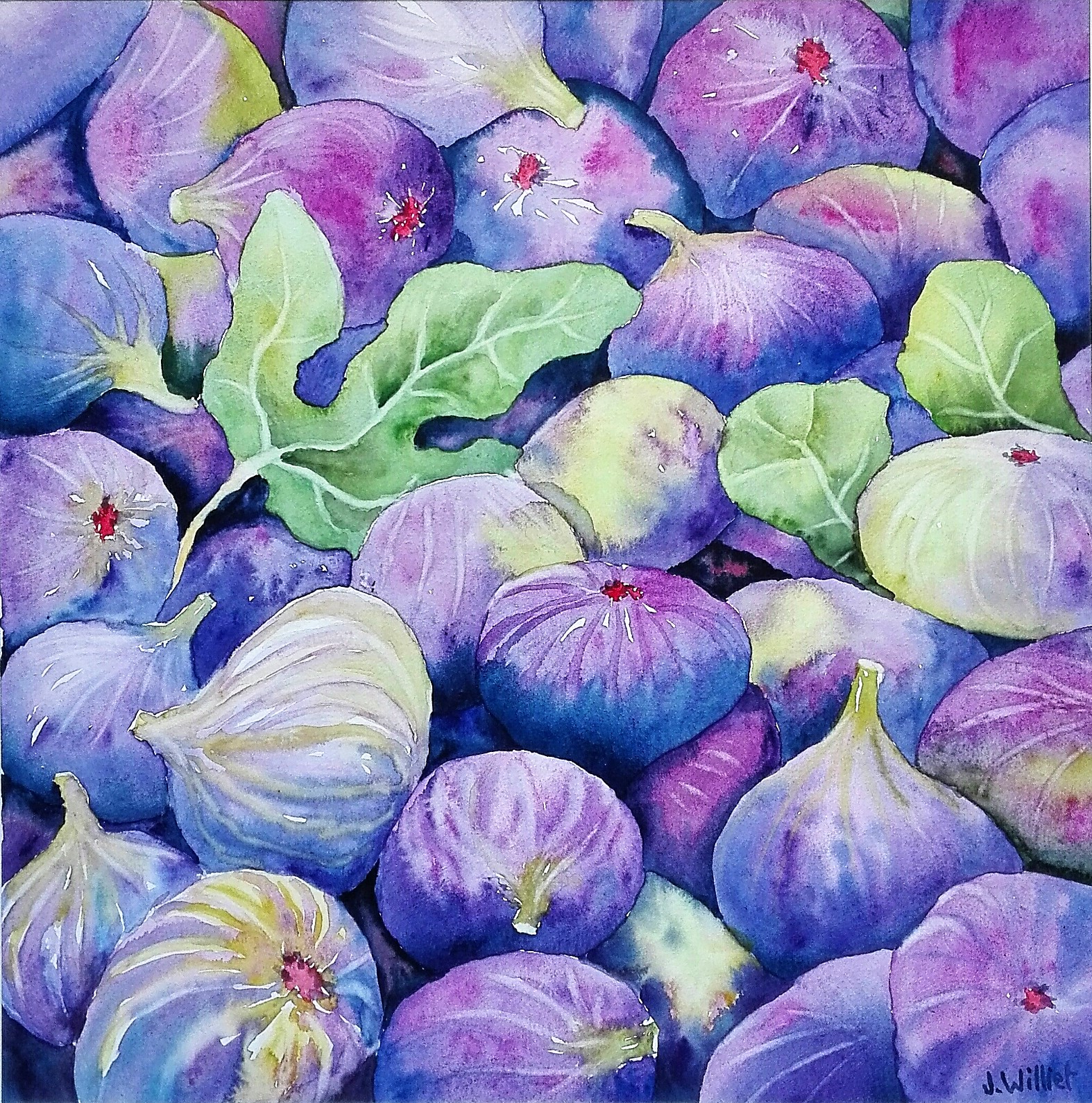 Au milieu de toutes ces salades entendues ça et là, je continue à peindre ; je délaisse un peu les lavandes pour quelques fruits . Des figues notamment, même si la photo fait trop ressortir les bleus :