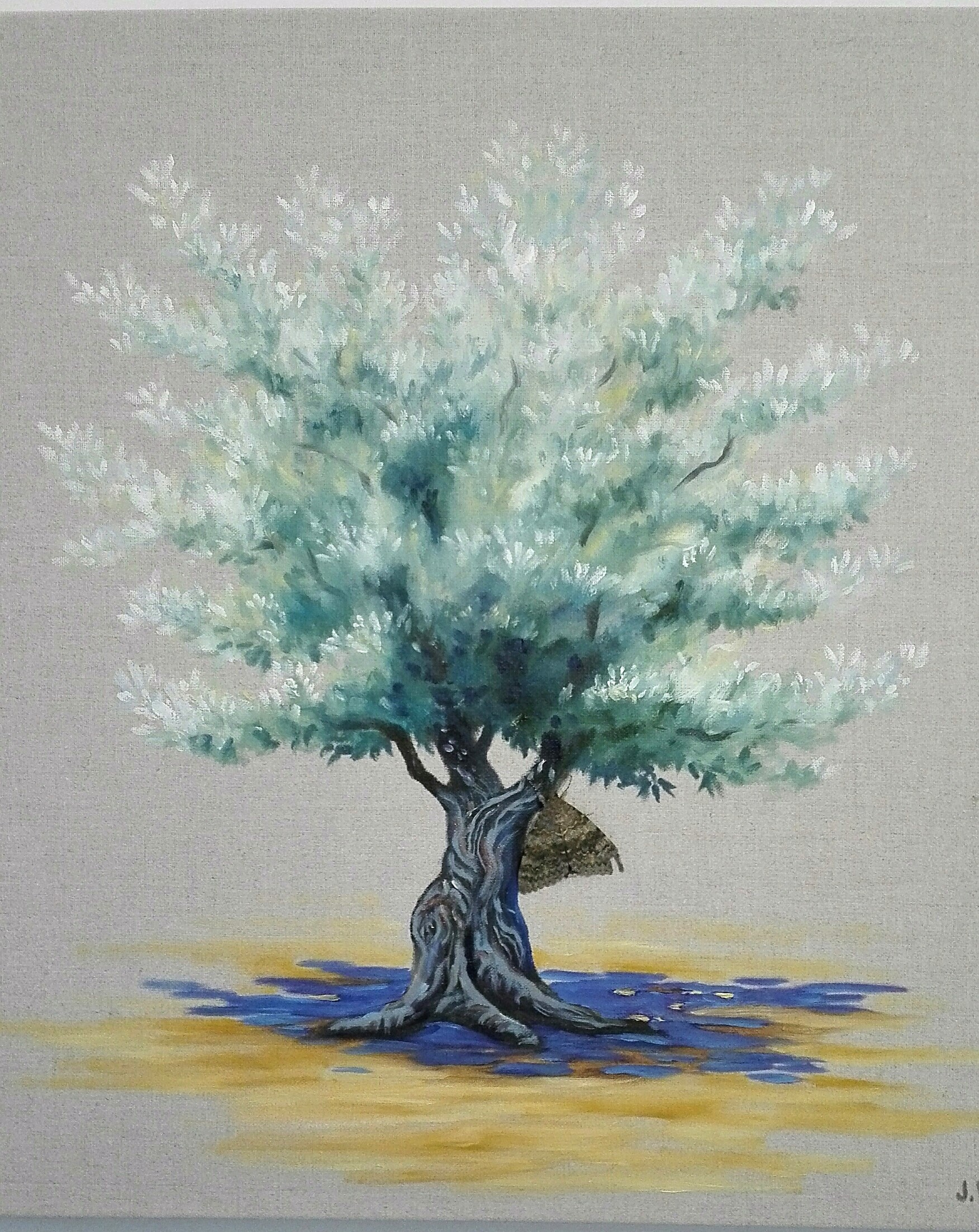 Accroché à la branche de mon olivier (peint à l’huile sur toile de lin).. Un papillon sur l’épaule de cet arbre.. Je vous parlais de signe l’autre fois, peut-être que la nature en envoie, effectivement..