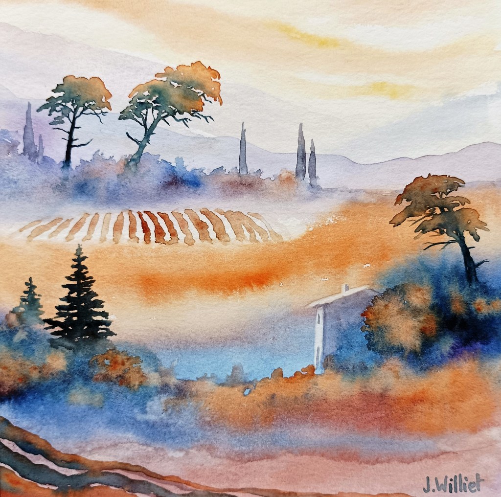 « Douce Provence » (20 x 20 cm), aux couleurs de cet automne qui approche (visuellement), avec juste quelques couleurs rousses et bleues..