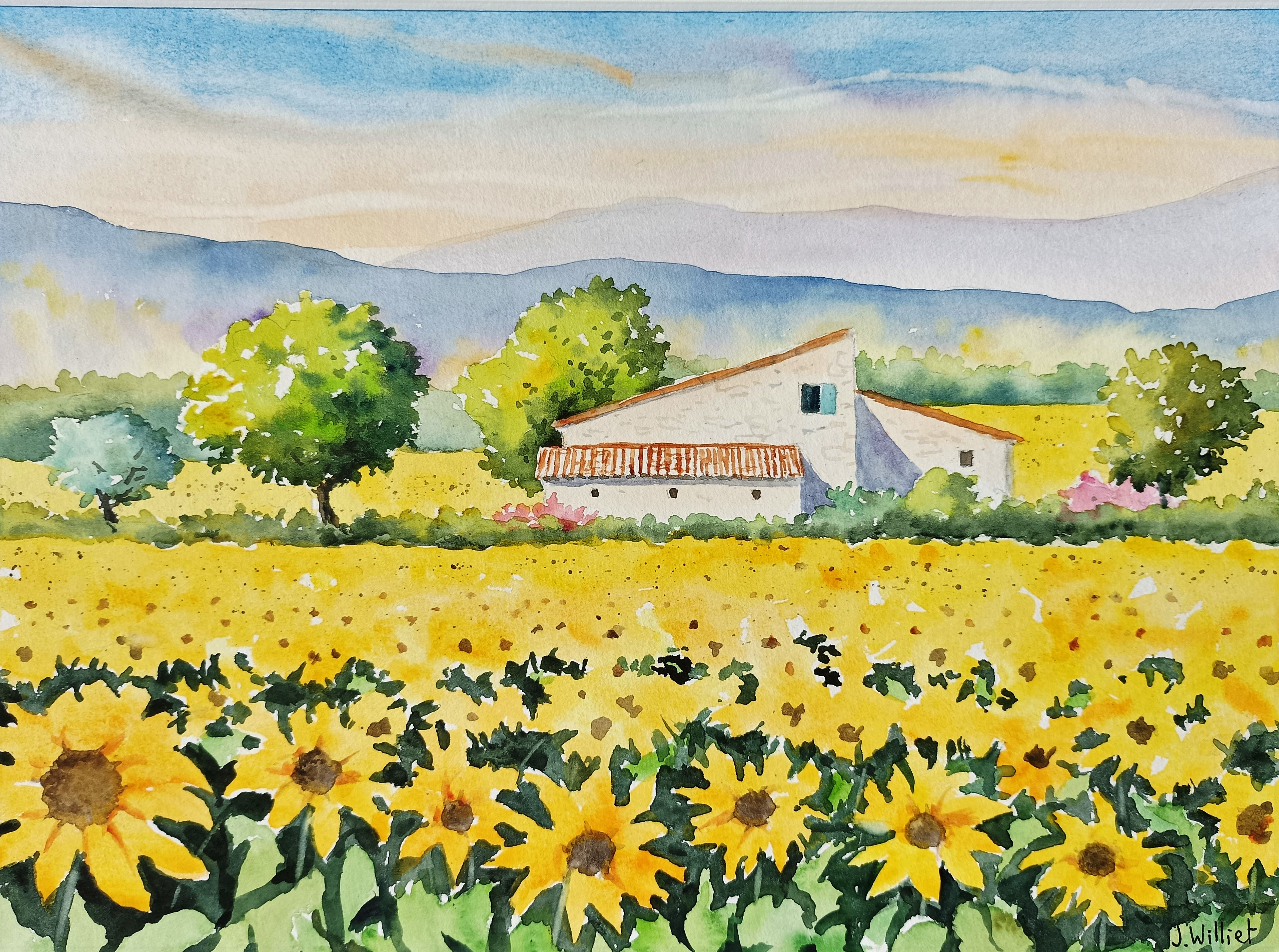 Rien de plus beau qu’un rayon de soleil dans la grisaille, il y a aussi des fleurs appelées soleil qui ressemblent à des tournesols ; c’est pour cela que j’ai peint cette aquarelle dernièrement :