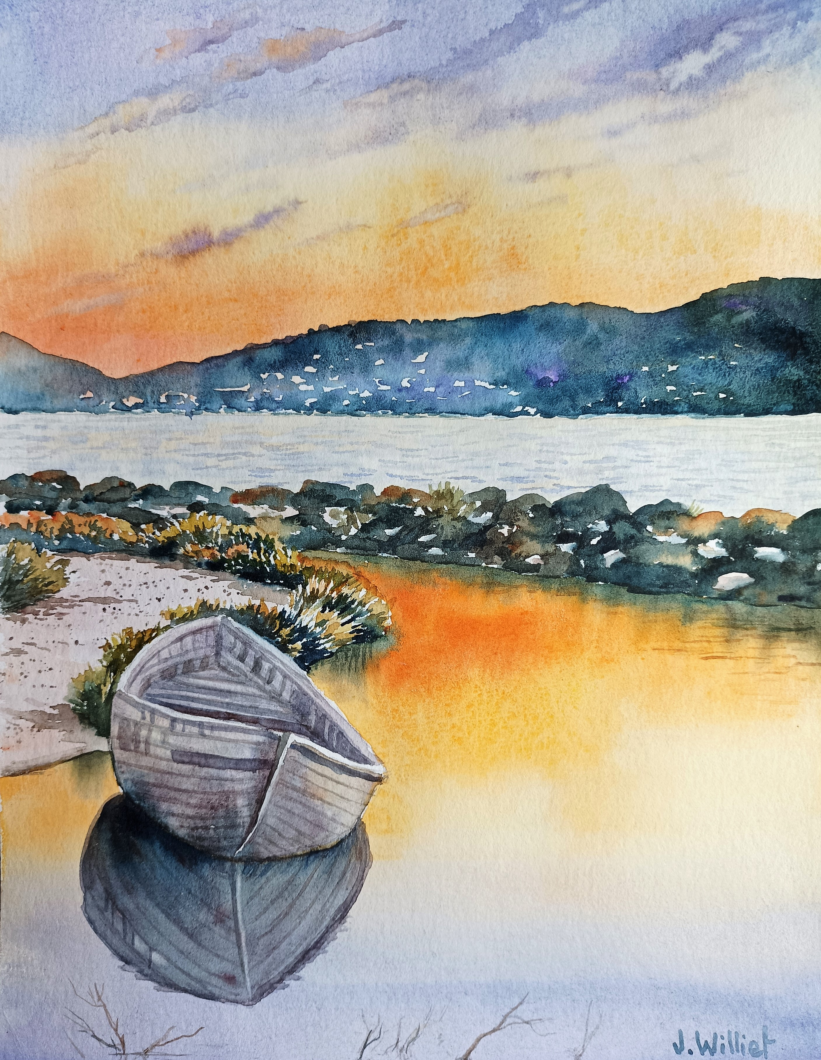 Le petit message de cette aquarelle reste clair cependant ; même si vous êtes en rade, ou abandonné, ne perdez pas de vue les couleurs magnifiques du ciel et des reflets qui vous entourent..