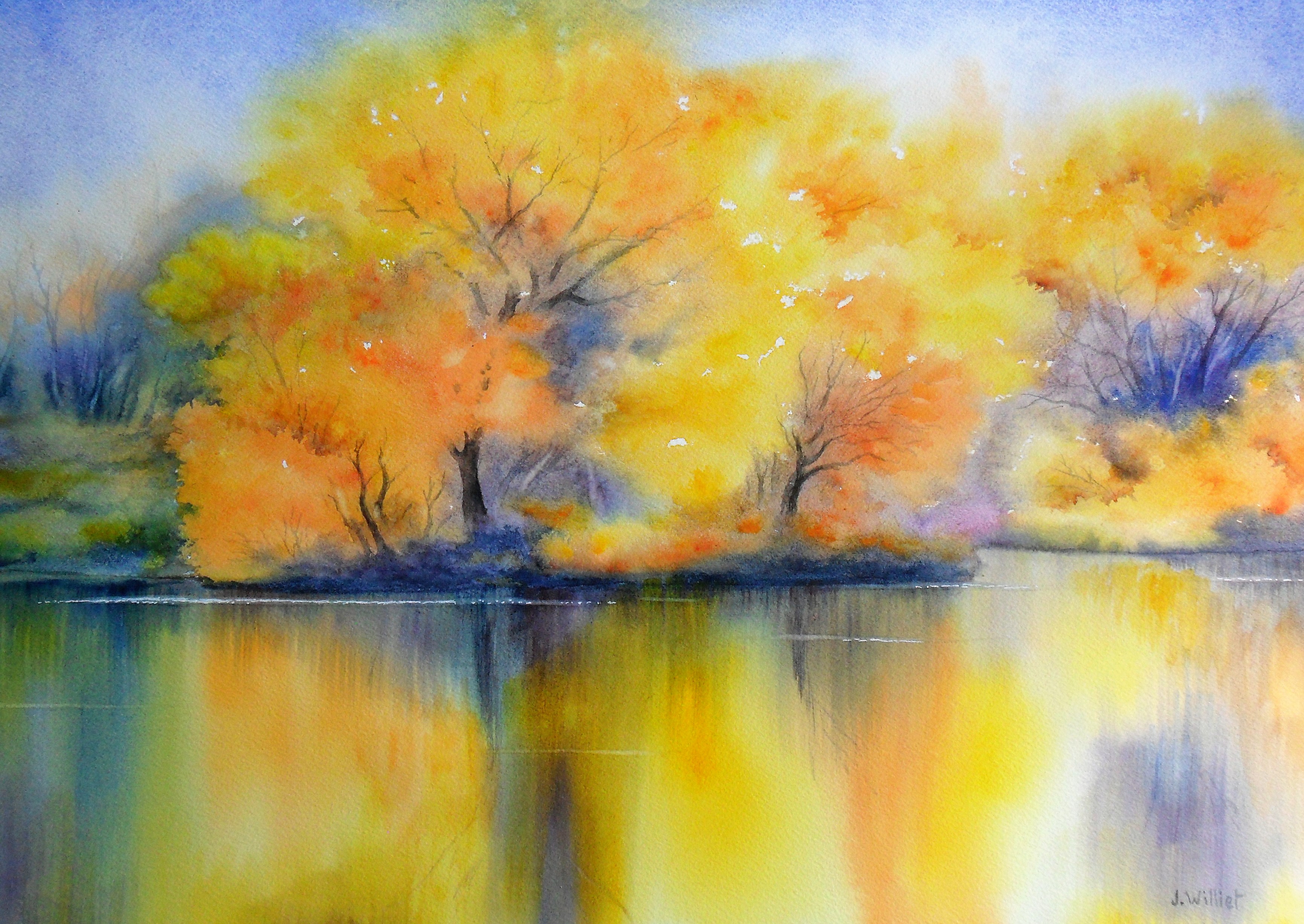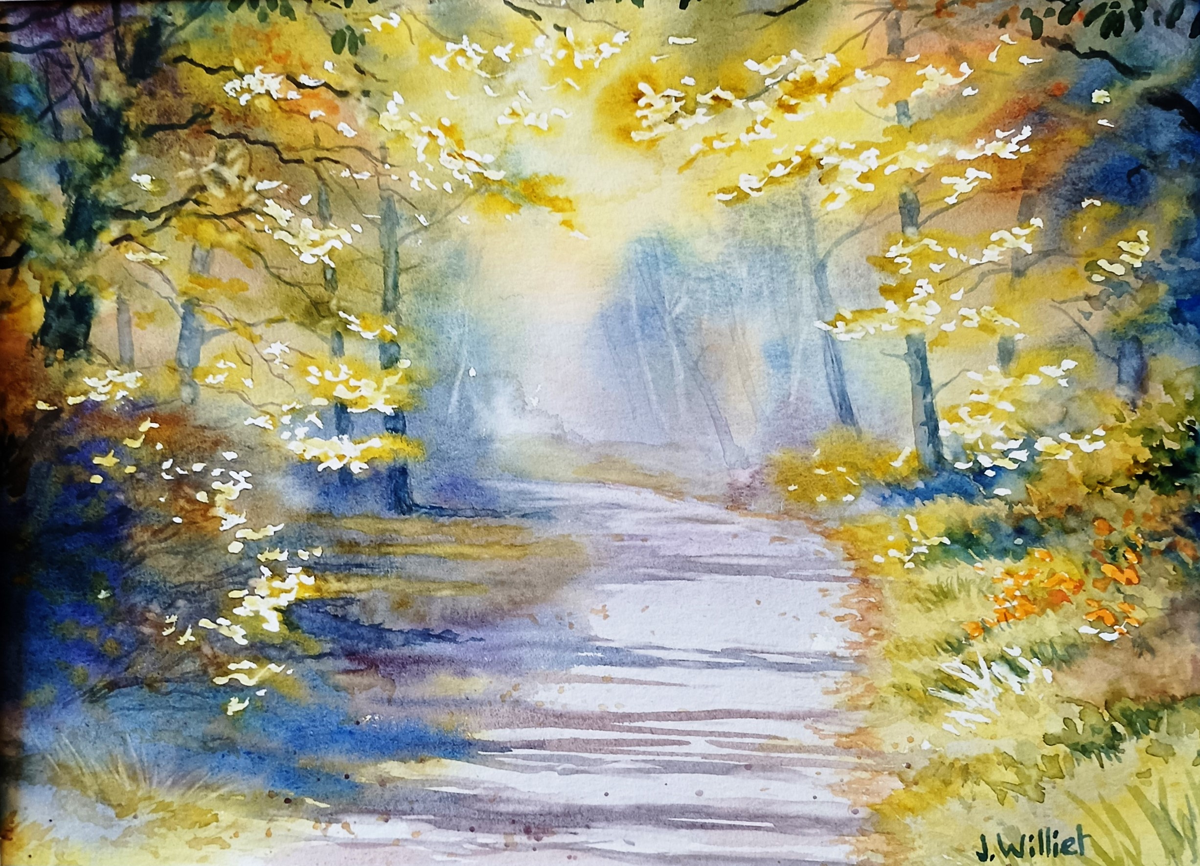 Vos 2 aquarelles avec les chaudes couleurs d’automne sont magnifiques! Le chemin en forêt est lumineux et invite à s’y promener… pour arriver au bord de l’eau et admirer le reflet des arbres. Merci Mr Williet pour cette belle journée de promenade automnale!