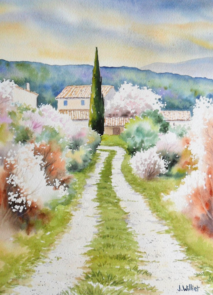 Cette aquarelle est l’une des 3 versions que j’ai faites de ce sujet. D’après une photo prise entre Apt et Villars. Je la dédie à tous ceux qui se reconnaitront dans cet exercice, dont un pas à pas est disponible. J’ai également une pensée pour celles qui ont des petits soucis de santé en ce moment, et je remercie aussi ces personnes qui me soutiennent.