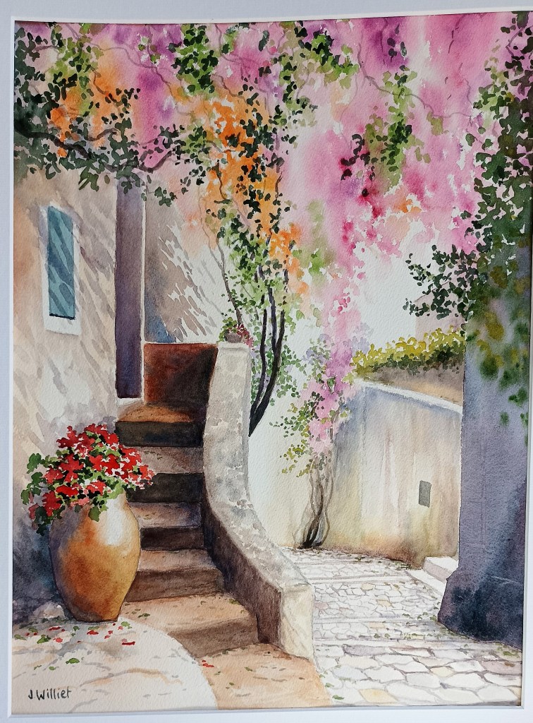 J’ai réalisé cette aquarelle cette semaine ; une ruelle fleurie :