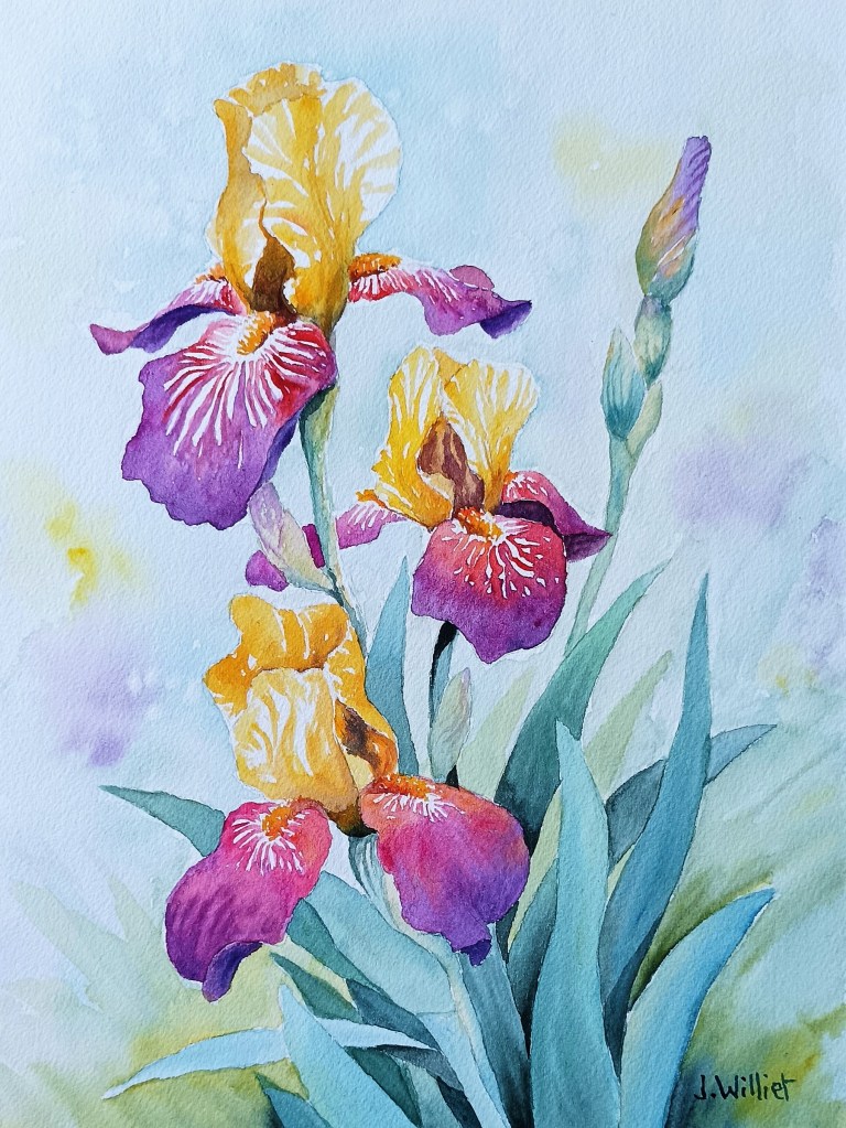 Il y a une quinzaine d’années, presque 20 ans même, je peignais davantage d’iris, et j’avais participé notamment à une expo à Beaumes de Venise sur ce thème. C’était vers la naissance de ma fille Inès. Comme le temps passe.. Je me suis remis aux iris pour cet exercice, et je vous présente ici une de mes versions :