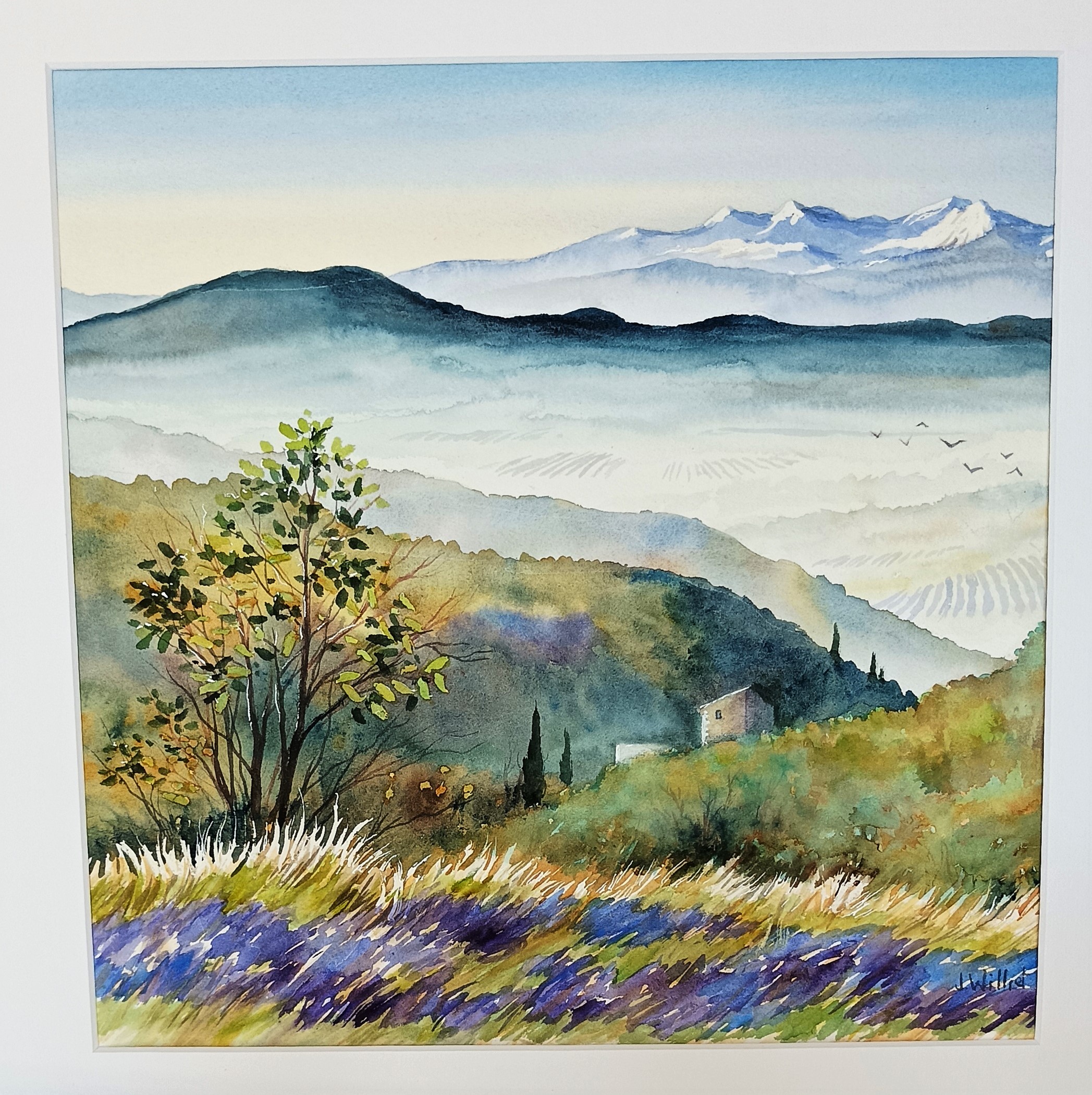 Voilà comment ces brumes d’automne sur les Alpes se sont transformées en Brumes sur les lavandes.. Il a fallu repasser des lavis à certains endroits, ouvrir des blancs pour créer des maisons, bref, changer l’ambiance..
