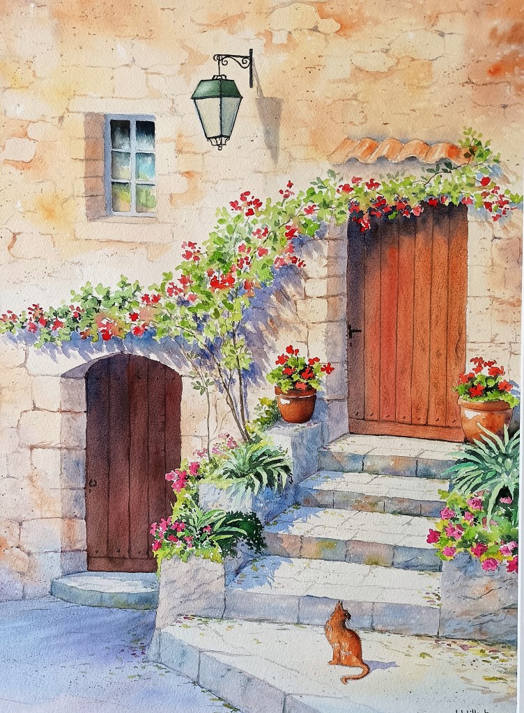 1. Les retouches d’aquarelles sont bien réussies. Les détails apportent effectivement un petit plus. (Chat alors…!) J’aime beaucoup aussi la réalisation de la façade de la maison. Vous avez également bien réveillé l’aquarelle (déjà très jolie) de votre élève grâce aux contrastes. Contente pour vous pour St Sériès. Amicalement.
