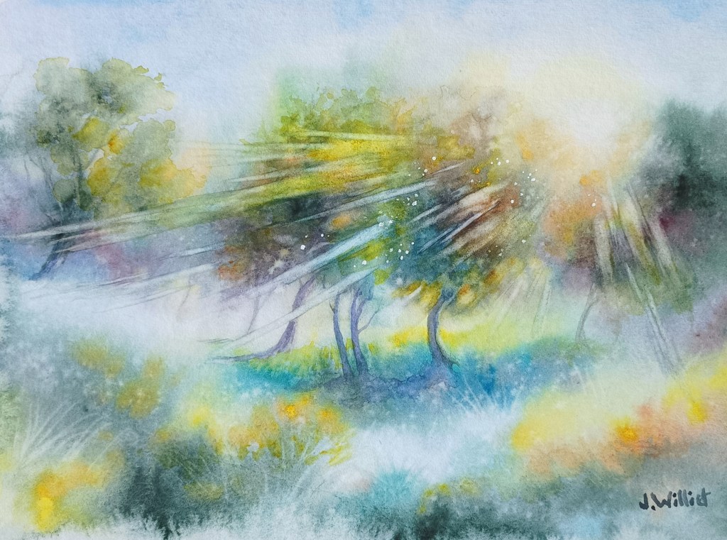 Fin janvier de cette année je postais un article intitulé « le soleil malgré tout ».. Illustré notamment d’une aquarelle où l’on voyait filtrer les rayons du soleil à travers les feuillages. Une ambiance un peu « féérique », en réponse à l’absence de soleil qui se faisait sentir à cette période si froide de l’hiver.. Le paradoxe , 6 mois après, est de se retrouver presque dans la situation inverse et de réclamer de la fraicheur et de la pluie.. Jamais contents que nous sommes, toujours à râler comme d’éternels insatisfaits.. Et pourtant, si nous prenions conscience de tout ce que l’on a, de cette chance de vivre en France, nous ne nous comporterions pas comme des enfants gâtés et capricieux.. Il faut réaliser que des centaines de millions de personnes dans le monde trouveraient miraculeux d’ouvrir un robinet chez eux et que de l’eau (potable en plus !) en coule, presque à volonté.. Et les températures que nous traversons, bien qu’excessives, sont souvent le quotidien pendant plusieurs mois de certaines populations ailleurs .. Alors oui, on râle, on se plaint de la chaleur, de l’inflation, etc.. mais n’oublions pas de relativiser..