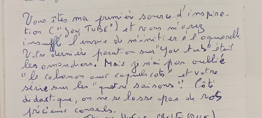 A propos de Youtube, vous avez pu constater que je ne fais plus de vidéos depuis plusieurs mois. Le manque de temps bien sûr, et aussi le manque de disponibilité de mon fils Valentin, aux manettes de la réalisation. Malgré tout, il m’arrive de rencontrer encore des gens qui me reconnaissent et me remercient pour ces vidéos.. J’en suis très touché. Comme ce monsieur ayant laissé ceci sur mon livre d’or :