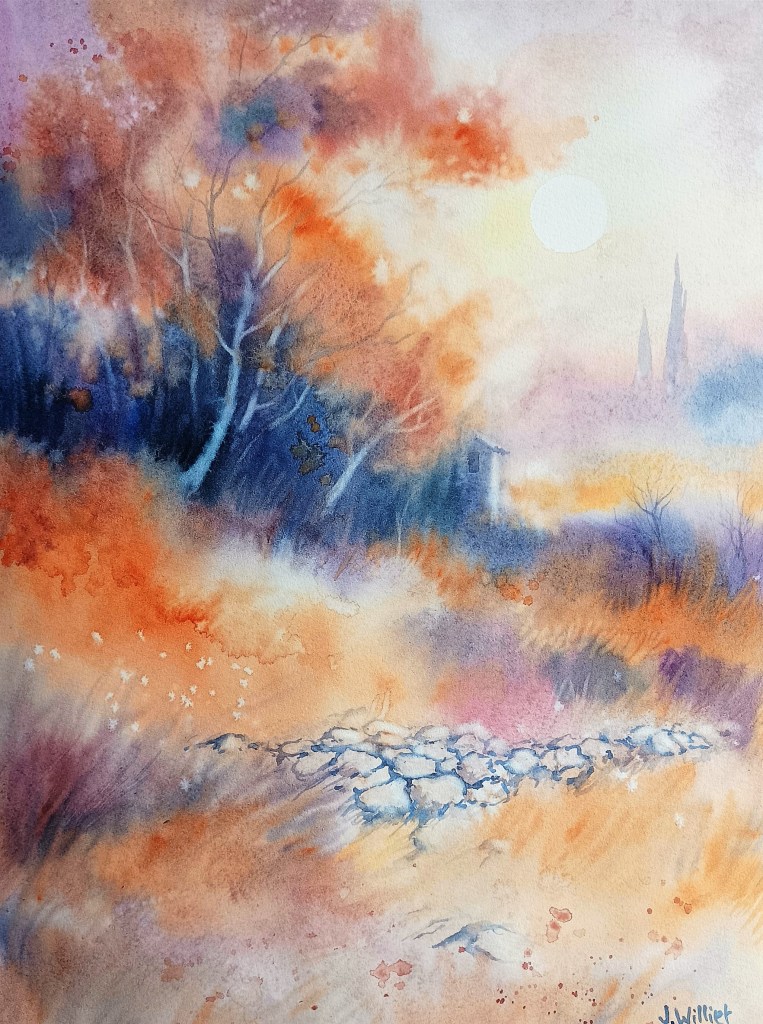 L’humidité et la grisaille sont de retour, le givre aussi ; je n’ai guère pu peindre souvent (si ce n’est avec mes élèves), il faut dire que l’on a besoin de se ressourcer un peu.. J’ai pu flatter mon égo de tennisman du dimanche en finissant invaincu du championnat par équipes de mon département. Ok, c’était en + 45 ans et en 2ème division, mais ça fait toujours plaisir.. On a beau rouiller un peu, cela donne l’illusion de valoir quelque chose encore, sportivement parlant.. Artistiquement parlant je me suis remis à peindre un jardin. Un grand format (43 x 60 cm) qui m’a demandé 1 semaine ! J’en voyais pas la fin.. Je vous le montrerai une autre fois. Pour ne pas perdre la main j’ai aussi travaillé en mouillé sur mouillé ; un fondu, dans des couleurs que j’aime bien :
