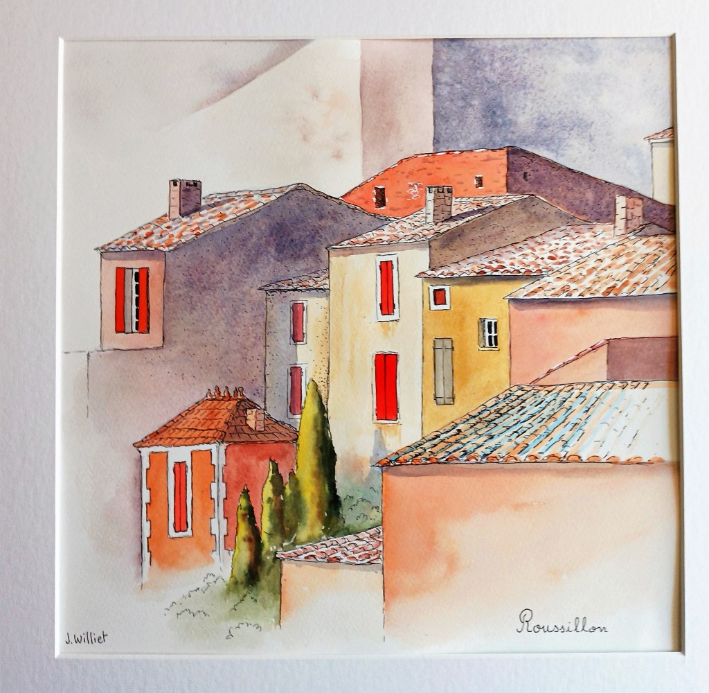 J’ai peint ces quelques façades de Roussillon (version illustration surlignée), avec ces volets rouges en point d’orgue :