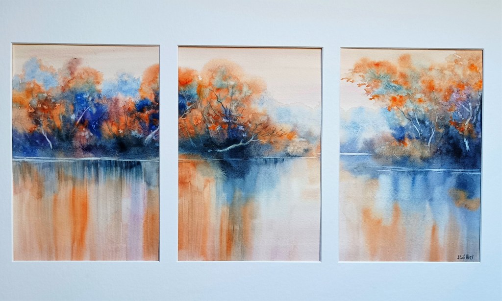 Sinon, je me suis plongé dans les reflets d’automne, en orange et bleu, dans le mouillé sur mouillé. Un triptyque plutôt grand (75 x 55 cm) :