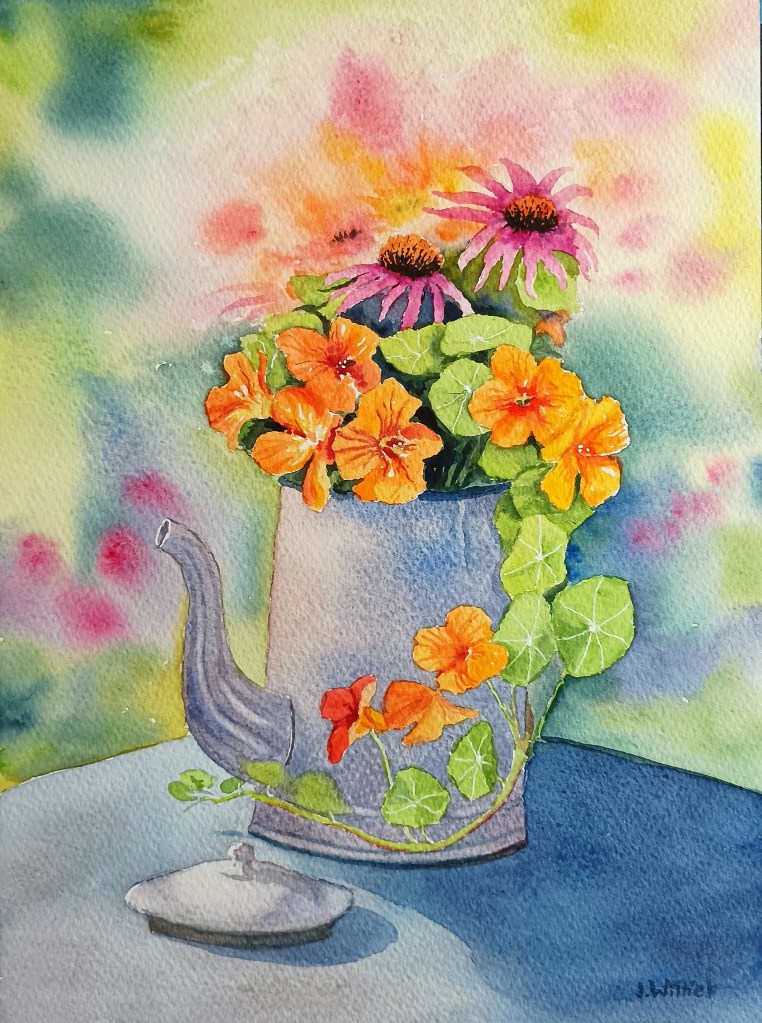 A l’heure où s’ouvrira l’Atelier galerie de Roussillon demain, pour une neuvième année (!), il me semble que c’était hier les premiers balbutiements d’ouverture en avril 2015.. La fin progressive des journées de peintres dans la rue et des petites expos ça et là.. Un changement de vie, un apprentissage permanent, comme pour l’aquarelle, qui ne cesse jamais de nous fuir alors qu’on s’en rapproche.. Il y a tant de progrès à faire, tant de choses à vouloir maitriser.. Dans mon désir d’amélioration j’ai travaillé beaucoup de sujets variés, d’approches différentes, et depuis une dizaine d’années je vous en fais part dans ce blog ; voici par exemple cette cafetière (ou théière) fleurie terminée aujourd’hui :