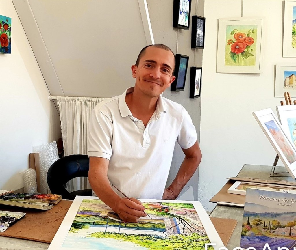 J’en profite aussi pour saluer Yves, collègue galériste, qui m’a pris en photo hier en train de finir ma nouvelle grande aquarelle..(Vous la verrez bientôt..).. Hé oui, les gens peuvent voir que je peins sur place, que ce n’est pas du « made in China » (ou Ikéa), un travail quotidien qui demande des efforts quotidiens.. Mais je ne suis pas du genre à me plaindre, si ce n’est de mes rides.. Alors yves m’a aussi envoyé la version « rajeunie » à la mode instagram :