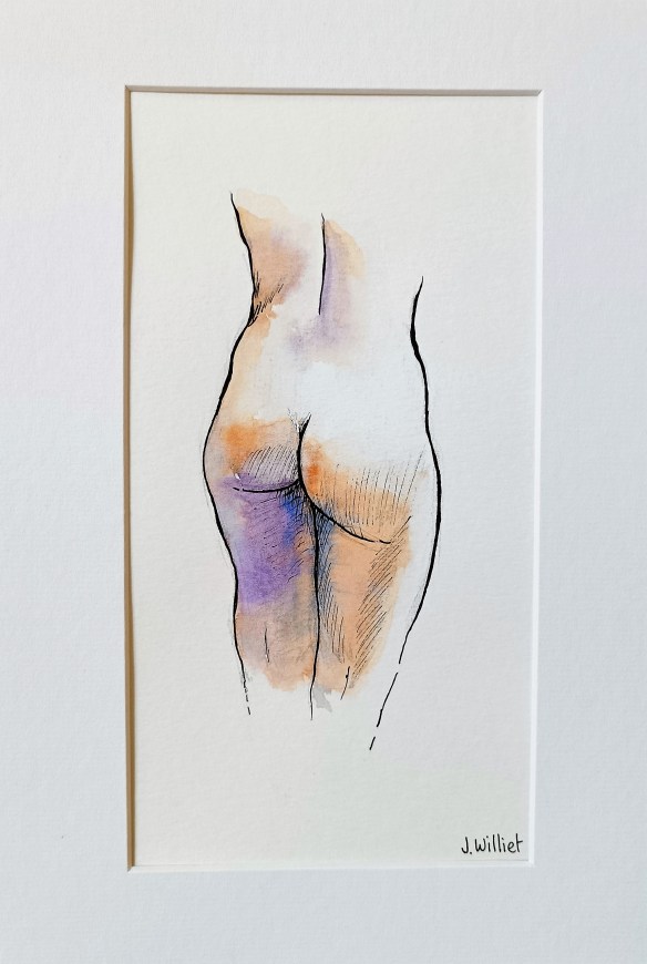 Il s’agit d’une aquarelle réhaussée d’encre pour le contour, tirée de mes séances de modèle vivant d’il y a quelques mois.. Les faits se contemplent… L’effet s’apprécie… Bref.. Là aussi je pourrais dire « Ah qu’elles sont jolies » les courbes de la féminité, mais bon, j’espère surtout que les prudes et puritains qui liraient ce blog n’en seront pas offusqués.. (Bouchez vous les yeux sinon..)..Je vous ai épargné le côté recto pour ne pas choquer les vierges effarouchées et les talibans de la morale.. Nous sommes dans une société où la moindre déclaration, la moindre image, peut être utilisée pour faire le buzz ou indigner des minorités pleureuses qui hurleront bien plus fort que la majorité dormante, comme souvent.. Et cela donne droit à des débats sur les radios ou les télés, inlassablement..
