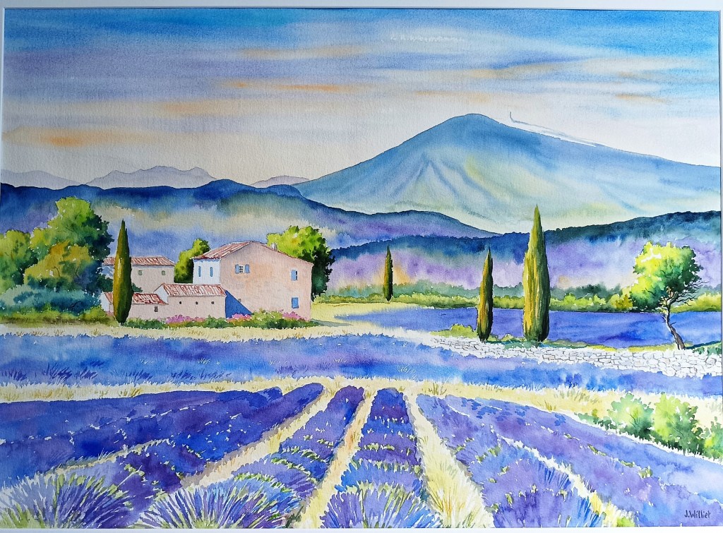 Un format 43 x 60 cm, où l’on peut apercevoir au fond une montagne bien connue.. (Non, ce n’est pas le Canigou).. Ce fameux temps des lavandes dure un peu moins d’un mois, selon l’altitude on peut trouver encore des champs pas encore coupés, mais c’est rare.. Place à autre chose maintenant, aux tournesols, aux lauriers roses ou grenats, aux roses trémières, aux fruits d’été qui nous ravissent.. La liste n’est pas exhaustive..