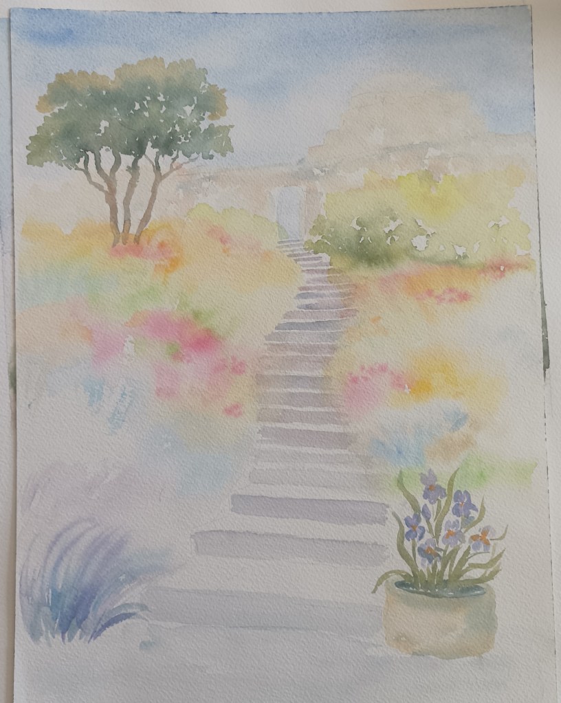 Oser métamorphoser. C’est ce que j’ai fait sur les 2 chutes d’aquarelles qui m’ont été confiées. La première représentait des marches, aux pourtours fleuris, un sujet que j’avais donné il y a quelques années à mes élèves. Voici donc la photo avant (projet abandonné) et la photo après (remise à flots) :