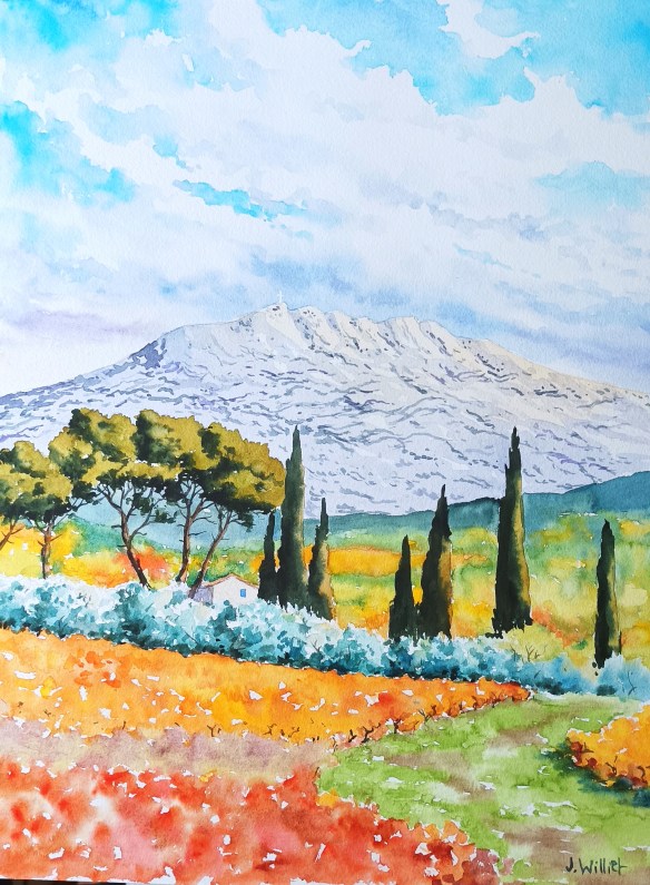 Voici donc mes 2 dernières aquarelles d’automne. La première est un hommage à la Ste Victoire ; un travail sur la profondeur, les contrastes des vignes colorées par rapport aux oliviers, aux cyprès et à la montagne..