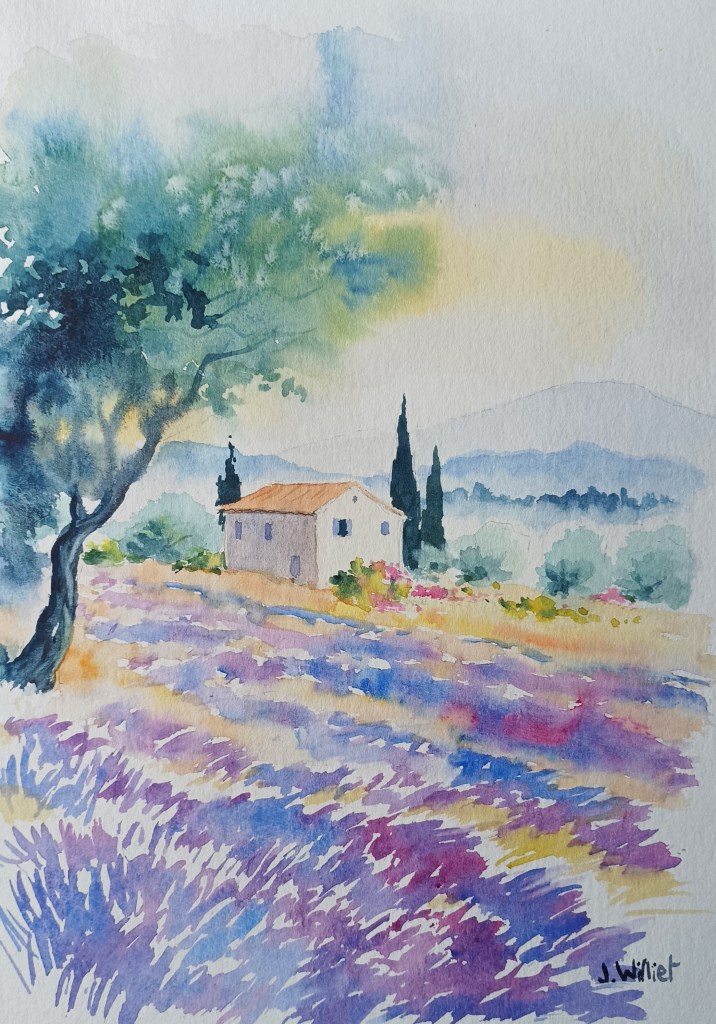 Bon, je vous laisse avec cette petite aquarelle colorée et lumineuse, d’un été (en plein hiver) ; des champs de lavandes qui donnent la nostalgie :