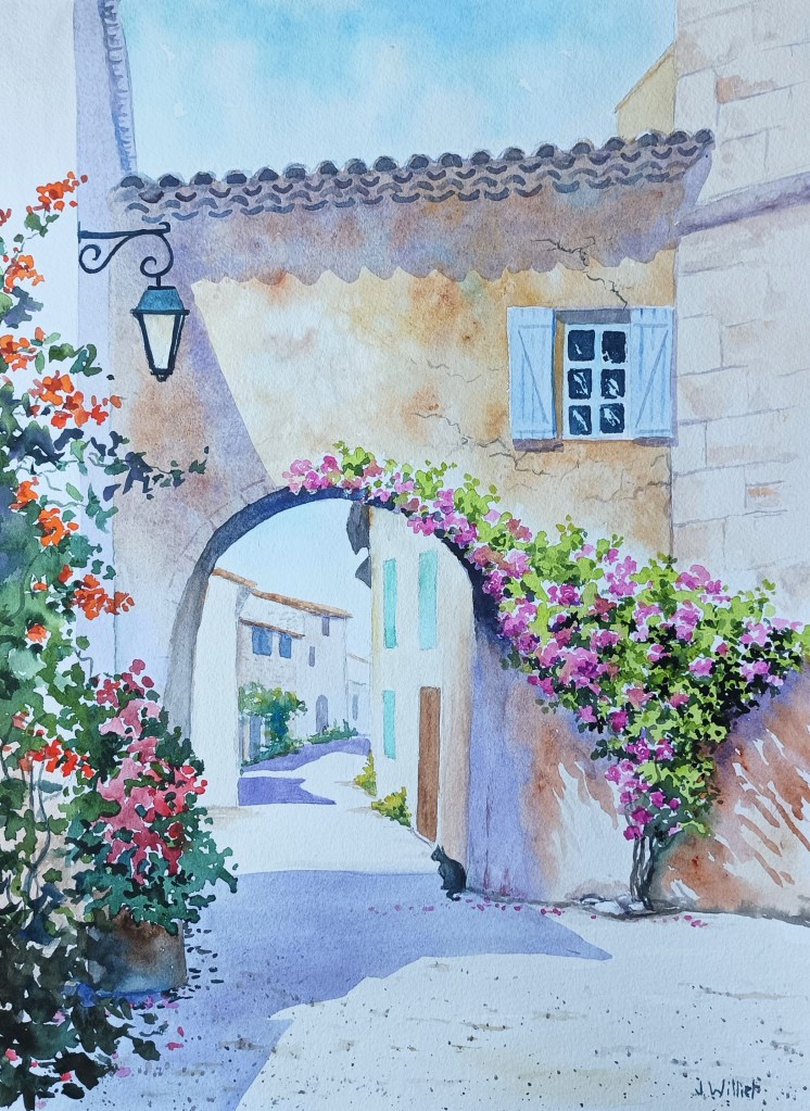 Je n’ai pas été très en forme en fin d’année, cette petite grippe m’a bcp fatigué, jusqu’à hier encore.. Du coup, je n’ai pas pu incendier des voitures de mon quartier comme le veut la tradition en France, ni brûler des poubelles…. Trop fatigué.. Et puis la grisaille qui s’installait dans le ciel me donnait envie de prendre un pinceau magique pour colorer tout ça, de bleu, ou de jaune.. J’avais envie de lumière et de couleurs.. Voici d’ailleurs la première aquarelle que je vous présente cette année : Un porche fleuri, dans la pleine lumière de l’été provençal :