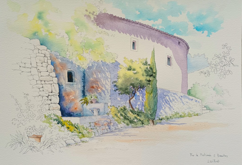 Cette « Fin de matinée à Brantes » est un format 35 x 50 cm, en style illustration, où j’ai laissé donc volontairement des zones dessinées mais non peintes.. Sans doute pour que l’imagination du spectateur fasse le reste..