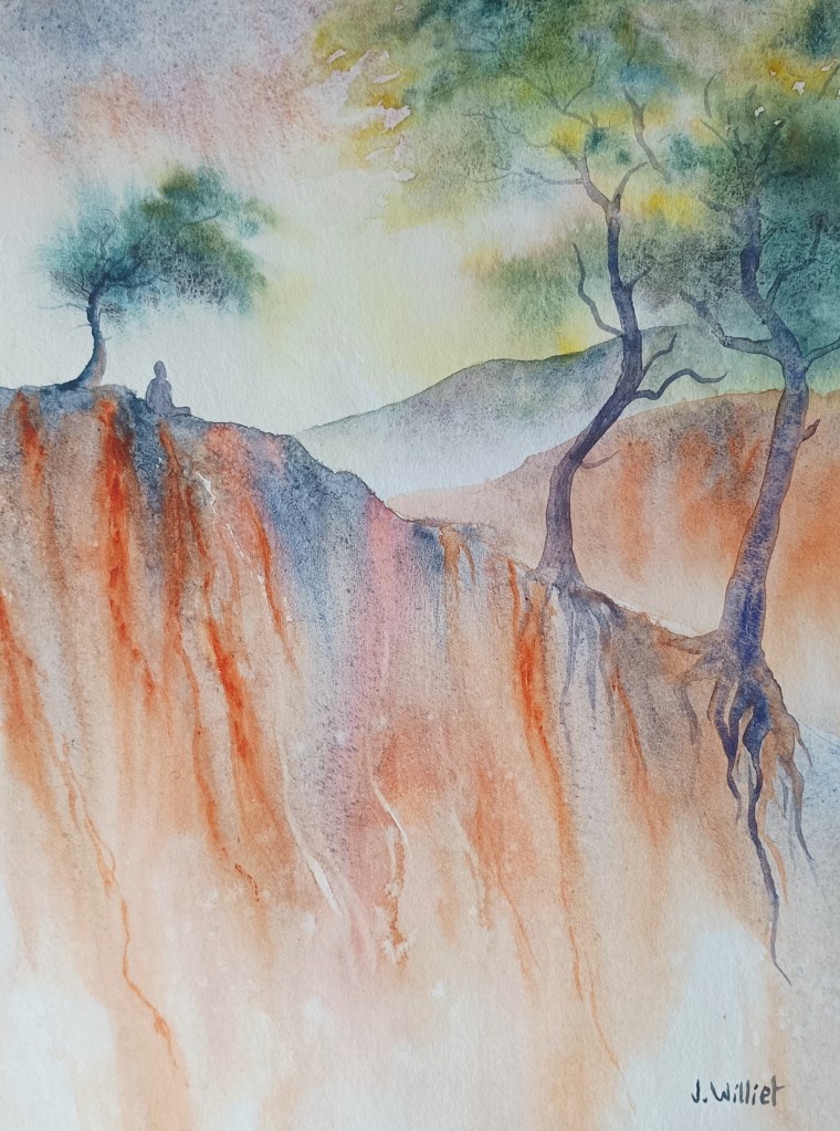 Cette autre aquarelle, réalisée en cours, est un travail dans le mouillé sur mouillé sur les amandiers en fleurs, autour de la petite chapelle N.D. des neiges, de Blauvac. Un sujet que j’ai déjà traité plusieurs fois à diverses saisons :