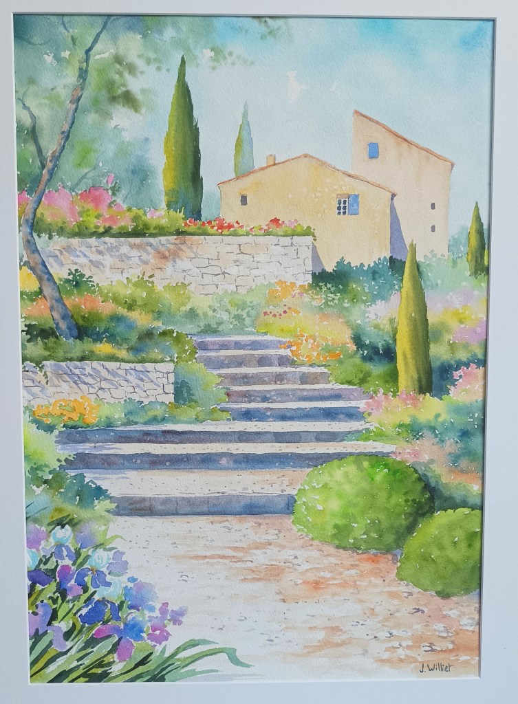 Niveau aquarelle je me suis tourné vers quelques ruelles fleuries, pour changer des lavandes ; voici cette maison en haut des marches, format 35 x 50 cm :