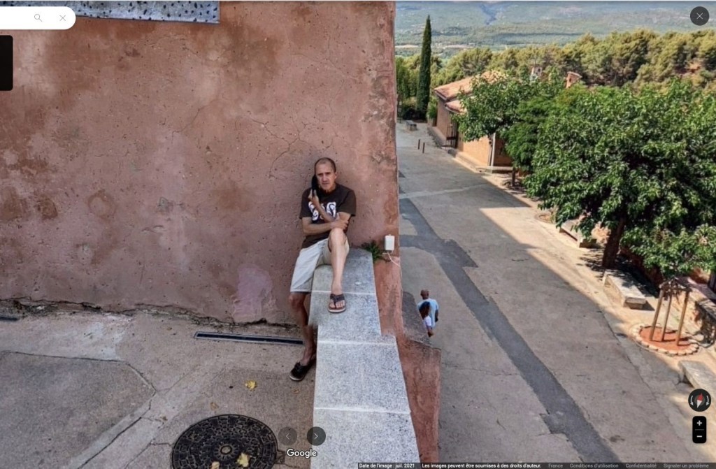 Photo prise en juillet 2021, alors que je suis sur le bord du parapet devant la galerie.. Je suis étonné que mon visage n’ait pas été flouté.. (Imaginez : j’aurais pu être pris dans les bras de Sophie Marceau à ce moment là, j’aurais dû m’expliquer..).. Bref, je devais téléphoner à Elon Musk qui me demandait un prêt.. Sans doute.. Vous remarquerez ma longueur de jambe (à gauche), on aurait dit celle d’Adriana Karembeu..