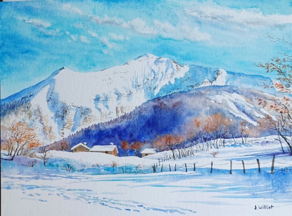 L’Avent des neiges s’est donc terminé mardi 24 avec l’aquarelle de la chapelle St Sixte sous la neige.. Comme une vision de crèche ; je trouvais qu’elle allait bien pour ce dernier jour..