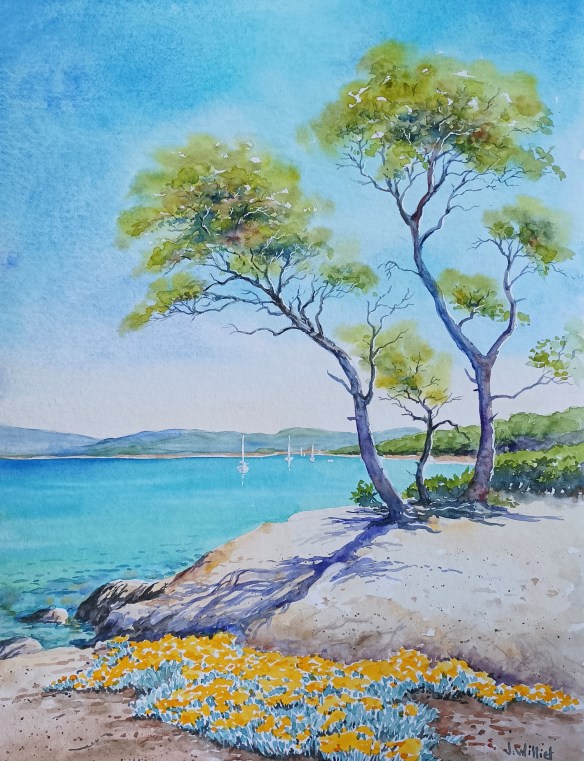 Dans la grisaille de décembre je voulais vous emmener sous le soleil de Porquerolles avec cette aquarelle :