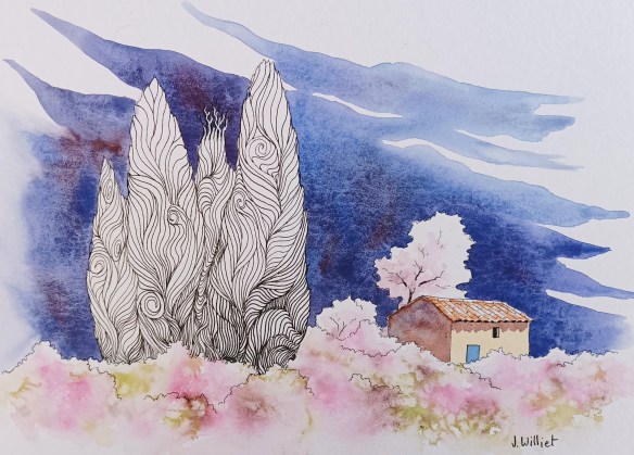 Dans le même principe du mariage de l’encre et de l’aquarelle j’ai aussi réalisé cette petite version à la Van Gogh de quelques cyprès au temps des amandiers en fleurs :