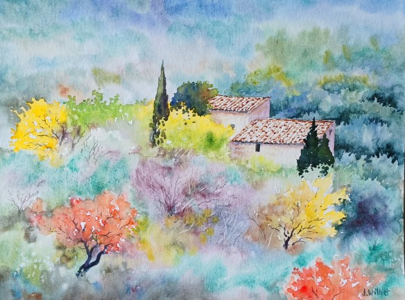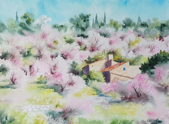 J’avais envie de commencer cet article par de la douceur, j’ai besoin de faire une pause, avec toutes cette actualité mondiale stressante.. Voici donc ce Mas aux amandiers, une aquarelle 30 x 40 cm réalisée avec mes élèves du mardi :
