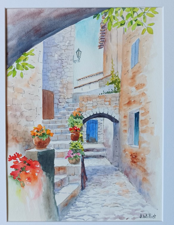 Cette dernière aquarelle est inspirée d’une ruelle à Eze ; il y a de l’orange de Chine là aussi, mais le reste peut s’organiser sans ça ; il y a d’autres couleurs..