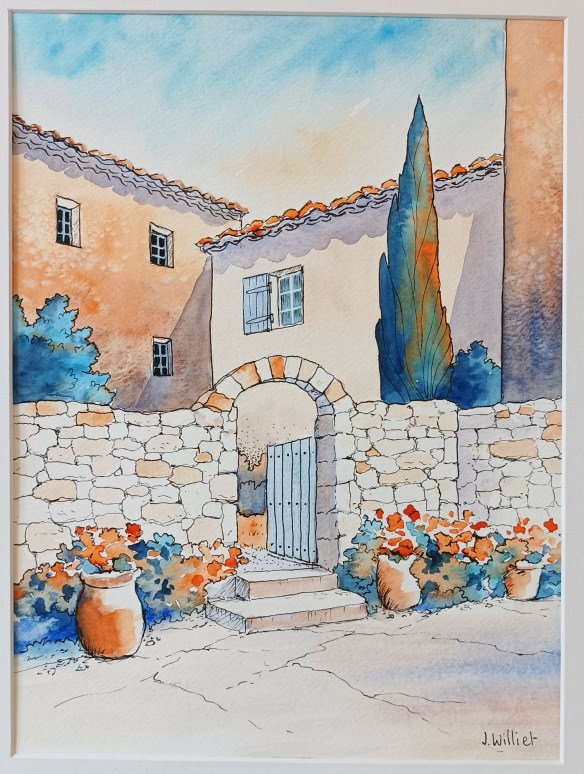Bref, la vie continue ; je ne suis pas allé me prendre en selfie auprès de sa dépouille, il y a des comportements de certaines personnes sans aucune conscience du manque de respect.. C’est la société du « Regardez j’y étais », au mépris de la décence.. Certains chefs d’état font n’importe quoi, des personnalités sont aussi condamnées ou accusées d’actes très répréhensibles, le monde perd ses valeurs en somme.. Mais je ne fais que dire des évidences.. Déjà il faudrait agir à notre niveau, autour de nous, en essayant d’être juste, respectueux et tolérant, pour contrebalancer la noirceur à notre manière.. Avec de jolies aquarelles par exemple.. En voici une avec des restanques et des amandiers :