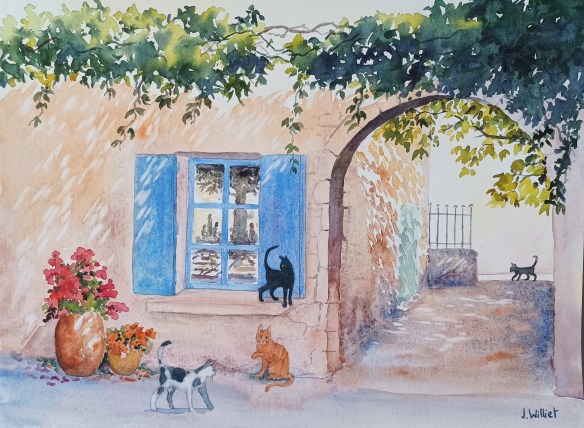 Cette façade de St Rémy de Provence était intéressante surtout pour ses jeux d’ombres et ses reflets dans les carreaux de la fenêtre.. J’ai jamais peint d’chats, ou alors y a longtemps, ou bien j’ai oublié.. (une petite référence à la chanson de Brel, bien sûr, « Ces gens là »…).. Cette aquarelle est donc à Roussillon depuis jeudi. Un restaurateur chinois a failli l’acheter pour y faire imprimer ses menus.. Non je rigole.. C’est de la caricature d’Instagram, ça finit par déteindre sur moi parfois..
