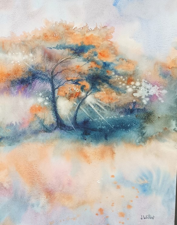 S’évader de ce marasme passe par l’aquarelle, c’est toujours possible et cela fait du bien.. Voici d’abord ces arbres dans la lumière :