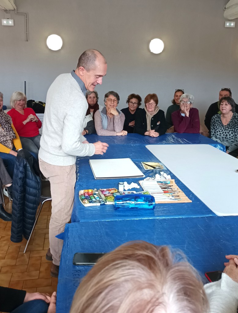 « Paroles paroles »…Rien que des mots, chantait Dalida, c’est une chanson dont on va ressortir les paroles à l’approche des municipales , et plus encore en pensant aux élections de 2027, mais bref, je ne vais pas parler politique aujourd’hui, j’ai beaucoup de choses à vous dire, et ça concerne l’aquarelle.. C’est mieux non ? Avec ce qui se passe dans l’actualité internationale je suppose que les mots d’un aquarelliste qui ne se prend pas au sérieux ont plus d’intérêt que les maux du monde .. ça reste léger. On en a besoin. Des mots pour vous parler Démo. Hé oui, mardi dernier j’ai été invité à Villeneuve lès Avignon pour faire une démonstration de ma technique d’aquarelle.