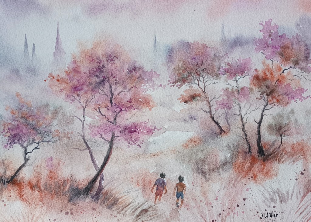 J’ai aussi modifié une de mes anciennes aquarelles (qui commençait à me lasser comme un discours de Bayrou).. Je l’avait peinte dans le mouillé et des tonalités rosées en 2024, et 2 petits enfants y exploraient le paysage.. « Souvenirs d’enfance » en était le titre. En voici sa version avant et après :