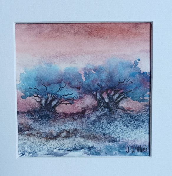 Avec des couleurs Daniel Smith pour la granulation au sol. Oui, 10×10 cm c’est petit, et , plus petits encore, les carrés de mes triptyques font 7×7 cm.. Des hobbits de l’aquarelle.. Mais il arrive qu’il y ait de réelles merveilles dans ces petits formats (que j’essaye de refaire en grand parfois), je vous le disais plus haut, ce n’est pas la taille qui compte.. Dans la galerie de Roussillon je propose pas moins de 10 formats différents, le choix est énorme, et donc c’est pour tous les budgets.. Petits et grands..
