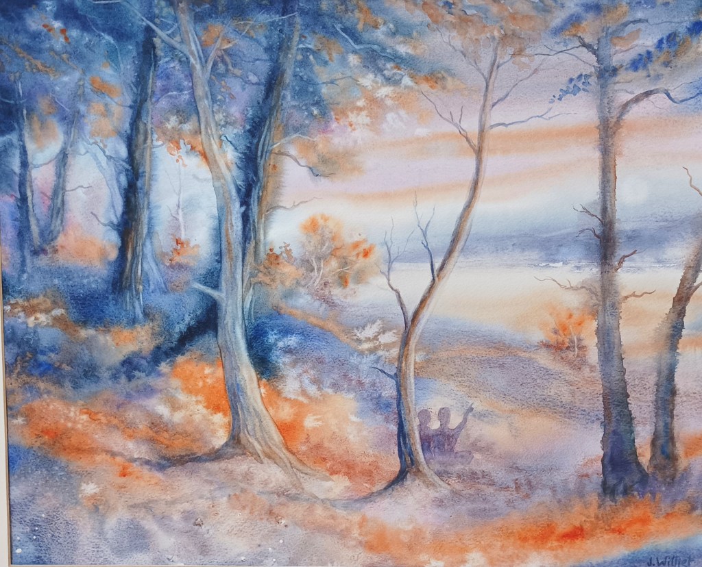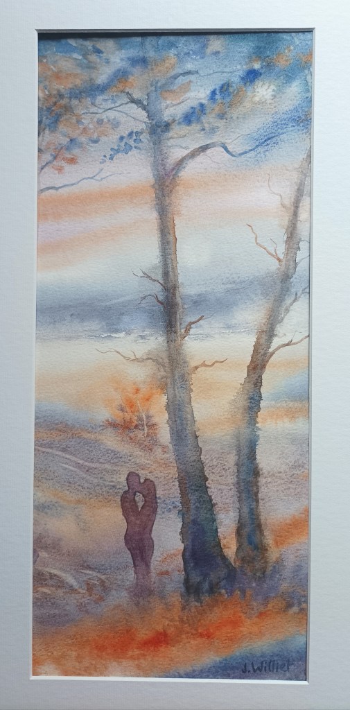Ce sont des évidences ; j’ai l’impression d’être en campagne électorale et d’exprimer ce que les gens pensent (ou veulent entendre).. Désolé. Je ne brigue aucun mandat. Juste un petit partage de mes pensées du jour.. A propos de « Partage », je voulais vous montrer cette transformation d’une aquarelle de l’année dernière. Elle s’appelait « L’émotion partagée ». Un travail dans le mouillé sur mouillé, qui plaisait à certains mais qui finissait par me gêner par sa composition. Il y avait une forêt, et sur la droite un couple assis qui regardait dans la même direction. (Fameuse illustration de « Aimer ce n’est pas se regarder l’un l’autre c’est regarder ensemble dans la même direction ».) .. J’ai finalement procédé à un redécoupage (électoral) et un ajout de couple enlacé :