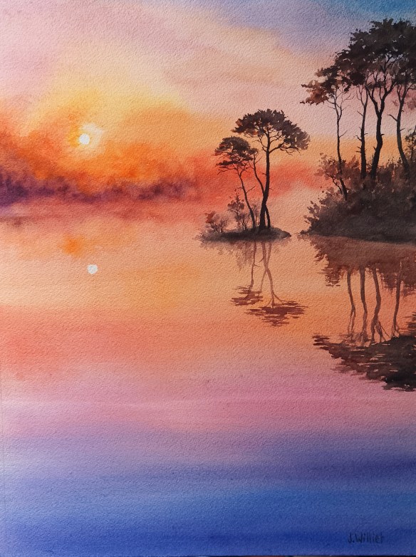 Les couleurs d’un coucher de soleil sur un lac, c’est aussi une émotion partagée ; la délicatesse des branches et des troncs nets qui se détachent du fond brumeux suffisent à donner du réconfort :