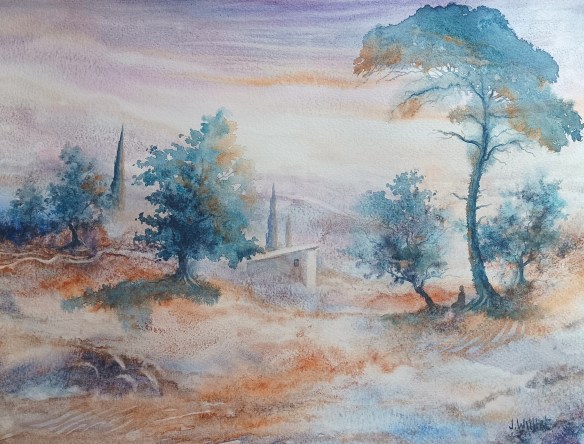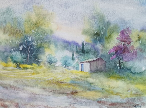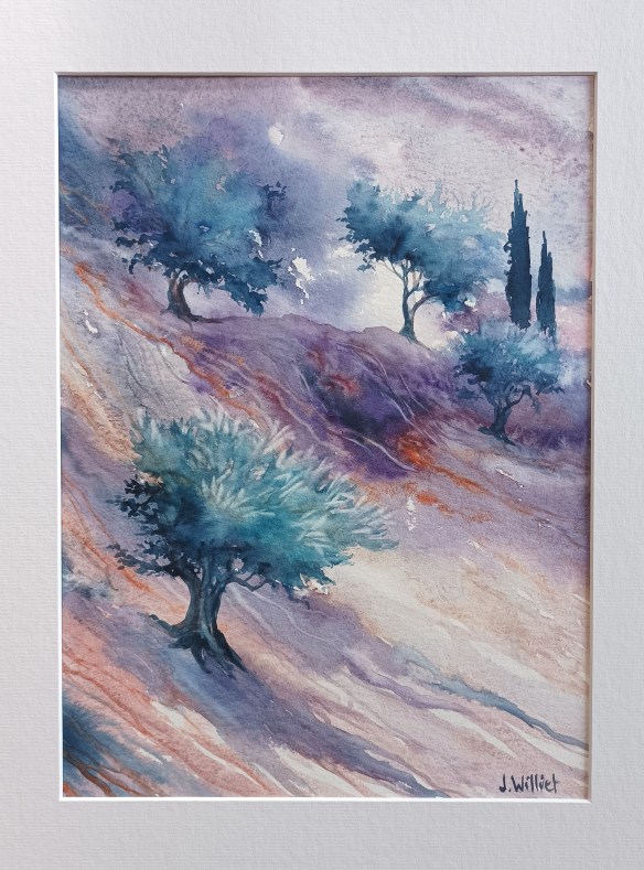 Ces oliviers dans les ocres ont aussi été travaillés dans le mouillé sur Moulin du coq, 22×30 cm. Voir ces aquarelles en vrai donne une meilleure impression qu’en photo.